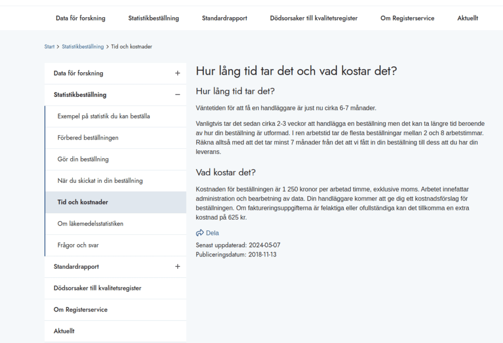Sex till sju månader, alltså. För en enkel specialkörning av statistik. Om ni undrar så innehåller detta register känsliga uppgifter – resultatet av själva körningen är dock inte känsligt. Vi vill helt enkelt bara veta hur många dagar i snitt som varje barn vistats på HVB-hem i varje kommun. Detta för att kunna beräkna dygnskostnaden.
