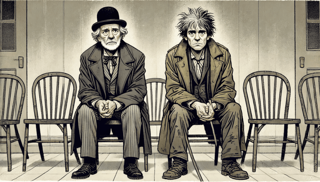 Vladimir och Estragon väntar på vård. Deras väntan är repetitiv och mållös, vilket skapar en känsla av meningslöshet och frustration.